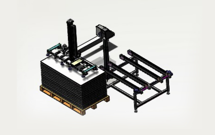 自動(dòng)排版機(jī)的主要功能單元有:玻璃輸送定位系統(tǒng)、抓取行走系統(tǒng)、視覺檢測(cè)系統(tǒng)、電控系統(tǒng)等;通過(guò)以上功能單元,實(shí)現(xiàn)了將自動(dòng)串焊機(jī)串焊好的電池串,按照工藝尺寸要求和排版方向順序自動(dòng)排版鋪設(shè)到玻璃(EVA已經(jīng)鋪設(shè))上,組成電池串陣列。玻璃/EVA通過(guò)傳輸線傳輸至指定位置,機(jī)械手抓取電池串實(shí)現(xiàn)CCD定位、自動(dòng)旋轉(zhuǎn)、自動(dòng)排版功能。設(shè)備通過(guò)同步帶傳輸與自動(dòng)生產(chǎn)線對(duì)接,實(shí)現(xiàn)了自動(dòng)流水作業(yè)。
